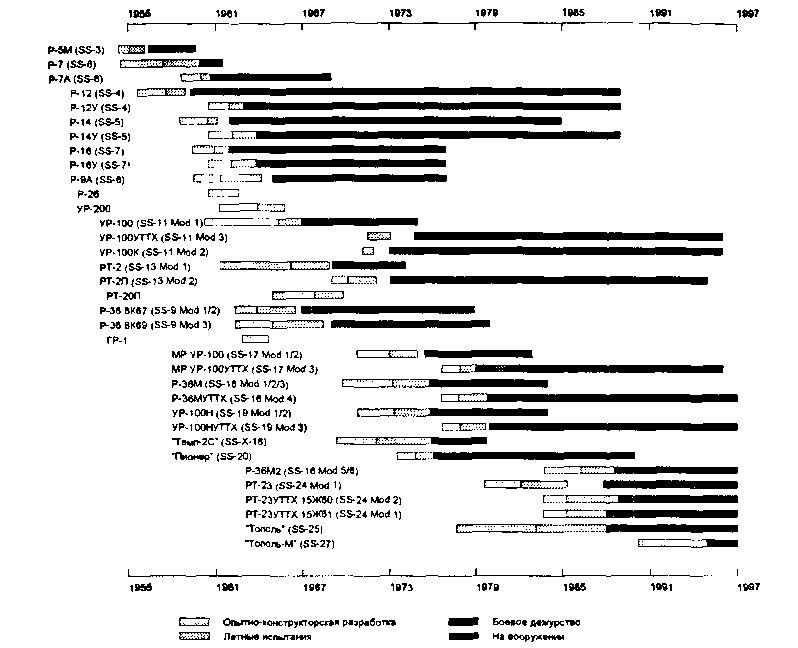 Войсковая эксплуатация первых пусковых установок типа "одиночный старт" началась в июле 1966 г. Комплексы Р-36 и УР-100 были приняты на вооружение в июле 1967 г., а твердотопливный комплекс РТ-2 —в декабре 1968 г. При этом массовое строительство пусковых установок для ракет УР-100 и Р-36 началось задолго до принятия этих ракет на вооружение.