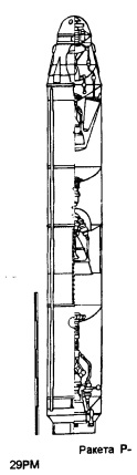 Р-29РМ представляет собой трехступенчатую жидкостную ракету с разделяющейся головной частью. Двигатели всех трех ступеней утоплены в баки. В отличие от Р-29 и Р-29Р, двигательная установка первой ступени имеет 4 рулевых камеры. Отличительной особенностью ракеты Р-29РМ является то, что двигательная установка третьей ступени объединена в единый блок с двигательной установкой разведения боевых блоков и они обе питаются от общих топливных баков.ь Головная часть ракеты Р-9РМ рассчитана на установку 4 или 10 боевых блоков индивидуального наведения.1* Боевые блоки размещаются во внутренней полости вогнутого конического днища верхнего бака второй ступени и располагаются по периферии маршевого двигателя третьей ступени. Диаметр корпуса ракеты Р-29РМ увеличен с 1.8 до 1.9 метра, что позволило увеличить запас топлива при незначительном увеличении длины ракеты (с 14.1 до 14.8 м).