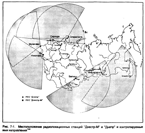 На западном направлении по одной РЛС "Днепр" были размещены на позициях в районе г. Николаев и у дер. Пестрялово в 20 км северо-западнее г. Бере-гово (узел "Берегово", известный также как "Мукачево"). Для прикрытия южного ракетоопасного направления в дополнение к существующим РЛС "Днестр" на позициях радиотехнических узлов системы контроля космического пространства ОС-1 на северном берегу оз. Балхаш и ОС-2 у пос. Усолье-Сибирское (в направлении пос. Мишелевка) в 90 км северо-западнее Иркутска были развернуты по две РЛС "Днепр". Как и на позиции радиотехнического узла в Скрунде, секторы обзора РЛС "Днепр" на ОС-1 и ОС-2 перекрывались, так что общий сектор обзора каждого из зтих двух вновь созданных узлов системы предупреждения составлял 180 градусов по азимуту.