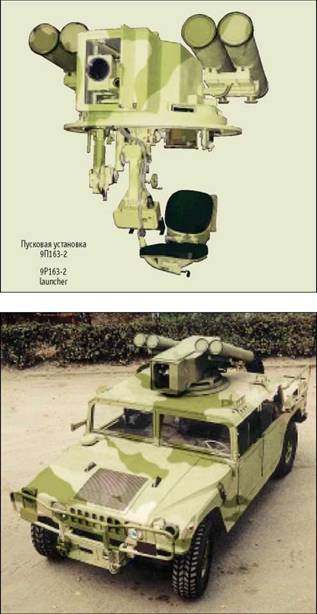 Пусковая установка 9П163-2 состоит из турели с четырьмя направляющими и ракет, при цела-прибора наведения 1П45-1, тепл о виз и он но го прицела 1П Н79-1, электронного модуля и места оператора. Отдельно размещается боеукладка на 5 ракет.