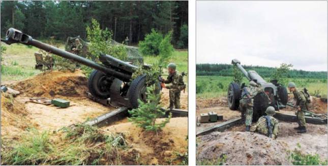 Гаубица выполнена на трехстанинном лафете, обеспечивающем возможность кругового обстрела. Для вывешивания колес используется гидродомкрат с поддоном. Заряжание ручное.