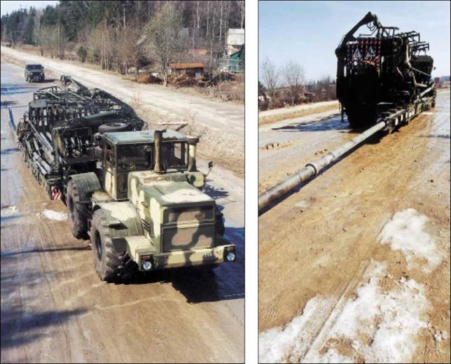 Перевозится двумя четырехосными железнодорожными платформами с тележками ЦНИИ-Х3-0.
