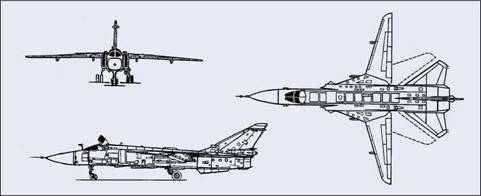 Самолет выполнен по схеме с крылом изменяемой стреловидности, имею­щим четыре фиксированных положе­ния крыла: 16°, 35°, 45°, 69°. Комплекс вооружения Су-24МК включает широкую номенклатуру управляемых и неуправляемых средств поражения. Основной вид вооружения - управляемые ракеты класса «воздух - поверхность» типа: