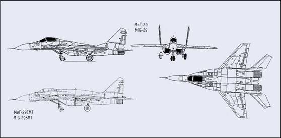 МиГ-29 изд. 9-13 - с двумя подвесными топливными баками (ПТБ) под крылом, увеличенной до 3000 кг боевой нагрузкой и станцией активных помех.