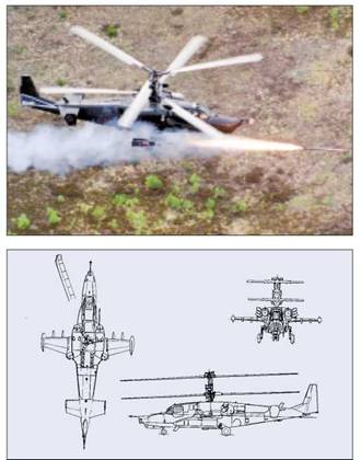 Предназначен для уничтожения броетанковой техники, борьбы с малоскоростными воздушными целями и поражения живой силы на поле боя. Ка-50 выполнен по соосной схеме с убирающимся шасси. Благодаря малым размерам, хорошим аэродинамическим формам и запасу мощности силовой установки вертолет способен использовать в бою нестандартные маневры типа плоского («педального») разворота. Это повышает эффективность применения оружия с первой атаки и дает преимущество в дуэльной ситуации.
