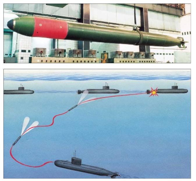 Состав боевой торпеды: система самонаведения, неконтактный и контактные взрыватели, боевое зарядное отделение, одноразовая серебряноцинковая батарея, приборы управления, электронный блок, торпедная катушка телеуправления (ТУ), электродвигатель, буксируемая катушка ТУ.