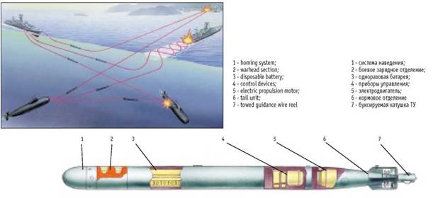 Состав боевой торпеды: система самонаведения, неконтактные (акустический, электромагнитный) и контактные взрыватели, боевое зарядное отделение, одноразовая серебряно-цинковая батарея, приборы управления, электронный блок, торпедная катушка телеуправления (ТУ), электродвигатель, буксируемая катушка ТУ.