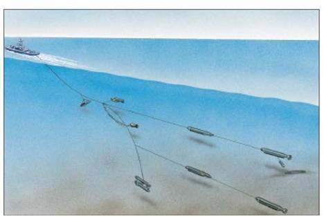 Подводное буксируемое устройство состоит из поисковых элементов, кассет обозначения с буями-обозначателями или уничтожения с бомбами, буксирнокабельной части и элементов, обеспечивающих требуемый ход его в потоке.