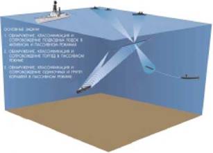 - дальнего обнаружения надводных кораблей в режиме шумопеленгования;
