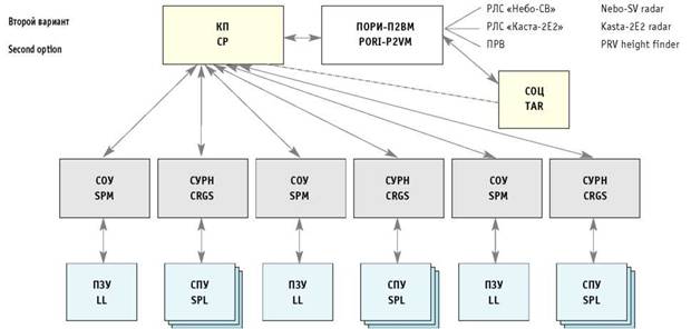 Три штатные батареи с модернизированными СУРН 1С91М1(М2) управляются по новым линиям телекодовой связи от доработанного командного пункта 9С470М1-2, а три батареи (в составе каждой одна СОУ 9А310М1-2 и одна ПЗУ 9А39М1) управляются по штатной линии СТС (9С624 - 9С625) от КП 9С470М1-2, принимающего радиолокационную информацию через ПОРИ-П2ВМ от новых РЛС «Небо-СВ», РЛС «Каста-2Е2» или модернизированных РЛС П-18, П-19, СОЦ 9С18М1 и штатного ПРВ.