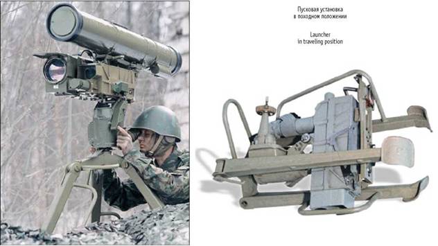 Пусковая установка 9П163-2 состоит из турели с четырьмя направляющими и ракет, при цела-прибора наведения 1П45-1, тепл о виз и он но го прицела 1П Н79-1, электронного модуля и места оператора. Отдельно размещается боеукладка на 5 ракет.