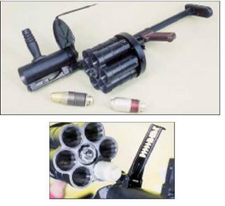 Гранатомет выполнен по револьверной схеме с вращением блока стволов от предварительно заведенной пружины. Ударно-спусковой механизм самовзводного типа. Приклад выдвижной. Заряжание производится с дульной части блока стволов, разряжание - путем нажатия на выбрасыватель. Снабжен предохранителем. Прицел механический, рамочного типа, корректирующий деривацию гранаты.