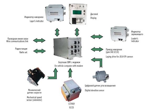 - бортовая ЭВМ со встроенным модемом: прием, обработка и хранение информации, расчеты текущих координат САО, расчет установок для стрельбы, передача донесений на машину управления;