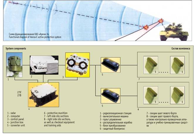сектор по азимуту, при этом зоны поражения соседних боеприпасов перекрываются, чем достигается возможность многократного перехвата целей, подлетающих к защищаемому объекту с одного направления. Общее количество отражений соответствует количеству устанавливаемых ЗБ (22 - 28). Перезаряжание ЗБ при необходимости проводится силами экипажа. Оснащение танка или БМП комплексом «Арена-Э» позволяет поднять их живучесть на поле боя в наступательных операциях приблизительно в 2 раза. Комплекс «Арена-Э» поражает средства, которые представляют наибольшую угрозу для объектов БТТ и противодействие которым не зависит от мастерства экипажа: управляемые противотанковые ракеты, атакующие БТТ с больших дистанций, и гранаты ручных гранатометов, действующих, как правило, скрытно, с любых направлений и минимальных дистанций. Эффективность применения объектов БТТ, оснащенных комплексом, резко возрастает при их использовании в миротворческих операциях, локальных конфликтах, когда противоборствующая сторона имеет на вооружении только легкие противотанковые средства.
