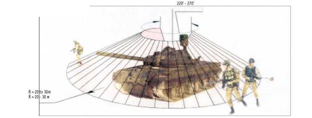 достаточен для защиты лобовой и бортовых проекций объекта БТТ и перекрывает возможный диапазон курсовых углов обстрела объектов БТТ при их наступлении на глубокоэшелонированную оборону противника;