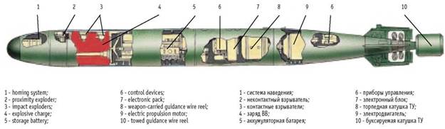 Состав боевой торпеды: система самонаведения, неконтактный и контактные взрыватели, боевое зарядное отделение, одноразовая серебряноцинковая батарея, приборы управления, электронный блок, торпедная катушка телеуправления (ТУ), электродвигатель, буксируемая катушка ТУ.