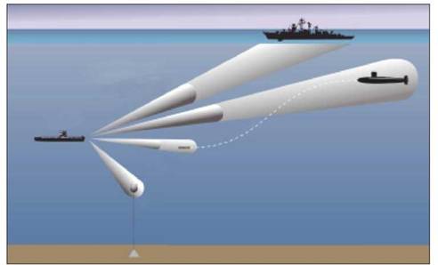 - обнаружения подводных лодок, надводных кораблей, торпед по их шумоизлучению;