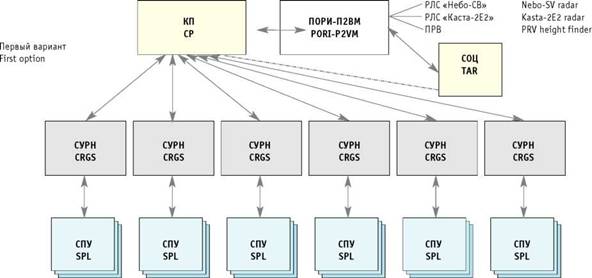 Три штатные батареи с модернизированными СУРН 1С91М1(М2) управляются по новым линиям телекодовой связи от доработанного командного пункта 9С470М1-2, а три батареи (в составе каждой одна СОУ 9А310М1-2 и одна ПЗУ 9А39М1) управляются по штатной линии СТС (9С624 - 9С625) от КП 9С470М1-2, принимающего радиолокационную информацию через ПОРИ-П2ВМ от новых РЛС «Небо-СВ», РЛС «Каста-2Е2» или модернизированных РЛС П-18, П-19, СОЦ 9С18М1 и штатного ПРВ.