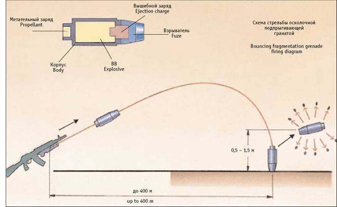 - осколочная подпрыгивающая граната ВОГ-25П (с подрывом боеприпаса на высоте 0,5 - 1,5 м от поверхности грунта). Гранаты оснащены взрывательными устройствами с механизмами дальнего взведения и самоликвидации. Конструкция корпусов предполагает заданное дробление при подрыве.